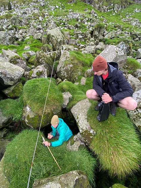 As for the week’s research work, one task dominating the daily routine was surveying the transect laid out in a remote part of the Storm-petrel colony (see previous post for the fun we had laying this transect in place!). This site, not far from the beautifully named ‘Southern Boulder’ (there are a lot of boulders in this immense basalt rockfield), is where we’re repeating a population census that was last carried out in 2013 by Tjóðsavnið (Faroe Islands National Museum). The survey requires at least 10 repeat visits to the transect site over the space of a few weeks, identifying Storm Petrel burrows and nest sites each time until no more new nests are added; at that point, we can be quite sure that we’ve pinpointed all active burrows across the transect area and can estimate the number of ‘Apparently Occupied Burrows’. This will provide a really useful comparison to the last census, and also to compare to another transect site being carried out in a similar manner by the museum staff this year.