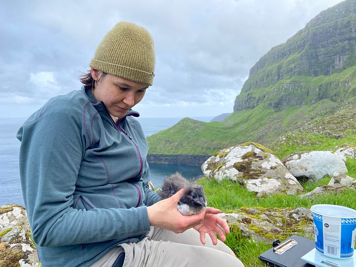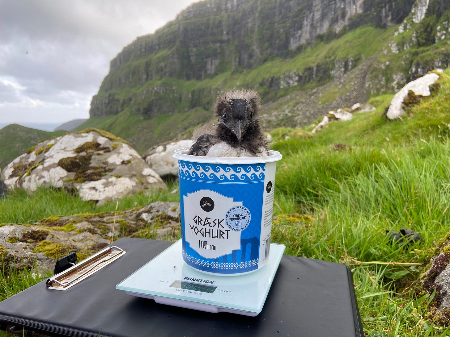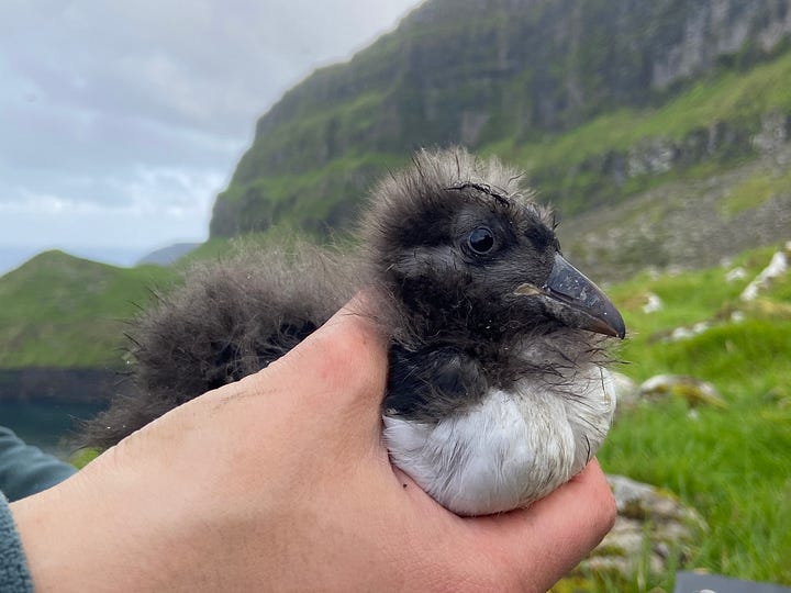 We once again have a pair of Puffins nesting in one of our artificial nest boxes here on Nólsoy, which allows us to closely monitor the chicks’ progress and assess how well the foraging conditions are for the parents. Sadly, the chick is growing very slowly, frequently dropping in weight over successive days and barely half of what it should weigh for its age. This could be partly down to new and less experienced parents, but more likely reflects the wider situation we’re seeing in the colonies this year - many dead chicks, a very late breeding season, and not enough high-fat, juicy sand eels being brought in.