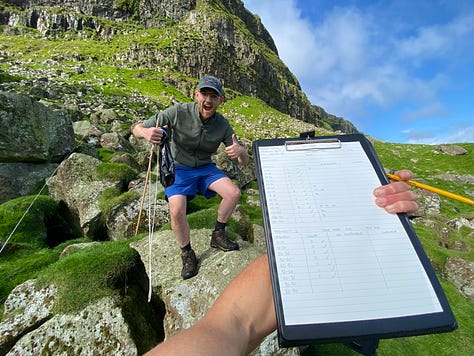 As ever, the mainstay of the research on Nólsoy has been regular checks of the 97 custom-built Storm-petrel nestboxes, installed since 2021 in the colony by the legend Jens-kjeld Jensen. Anne and Jason have been heading up the regular nest checks over the last couple of weeks, giving time for me to get out and carry out other important aspects of my PhD work such as fish farm surveys (see below). Thus far, it’s looking like a brilliant year for our Storm-petrels in the nestboxes, with 45 birds now on eggs (or egg, rather - they only have one each!), and 60 of the boxes have had some visitation from adult birds; many of these are prospecting pairs that we see once or twice during the summer but will not attempt breeding until next season. Further to the occupancy rates, the regular checks also allows us to understand the timing of key breeding events - such as exact egg laying dates (which varies wildly in Storm-petrels in response to environmental conditions). Thus far this year, our median lay date is 29th July, which is very comparable to last year but generally later by about 10 days than we observed in 2021, 2022 and 2023. We weren’t here for the earliest egg lay dates, and so it’s uncertain exactly when the first chicks will hatch, but around 15th August is often the earliest possible date - so this time next week we might have our first little fluff balls in the boxes!